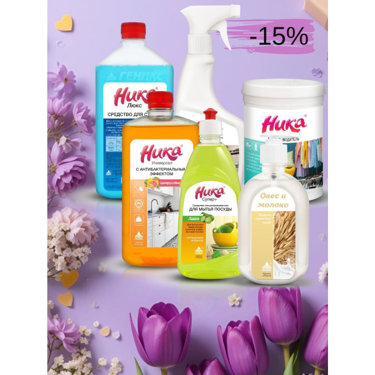 Средство от жира "Жироудалитель", - Состав: Поверхностно-активные вещества < 5 %. Гидроксид натрия 5-15 %. Комплексообразователь < 5 %. Стабилизирующие и вспомогательные компоненты. Вода. Средство для мытья пола и поверхностей "Ника Универсал антибактериальный" - Состав: НПАВ менее 5%. Дезинфицирующий компонент. Средство для мытья посуды "Ника Супер плюс" - Состав: АПАВ >5%. НПАВ <5%. Ароматизирующяя добавка. Загуститель. Пищевой краситель. Средство для стирки "Ника Люкс" - Состав: НПАВ ≈30%. Фосфаты <5%. Комплексообразователь. Оптический отбеливатель. Ароматизирующая добавка. Краситель. Вода. Средство от пятен "Ника Пятновыводитель" - Состав: Кислородный отбеливатель примерно 30%. ПАВ. Натрия триполифосфат. Активатор. Оптический отбеливатель. Энзим. Мыло жидкое "Овес и молоко" - Состав: АПАВ. НПАВ.